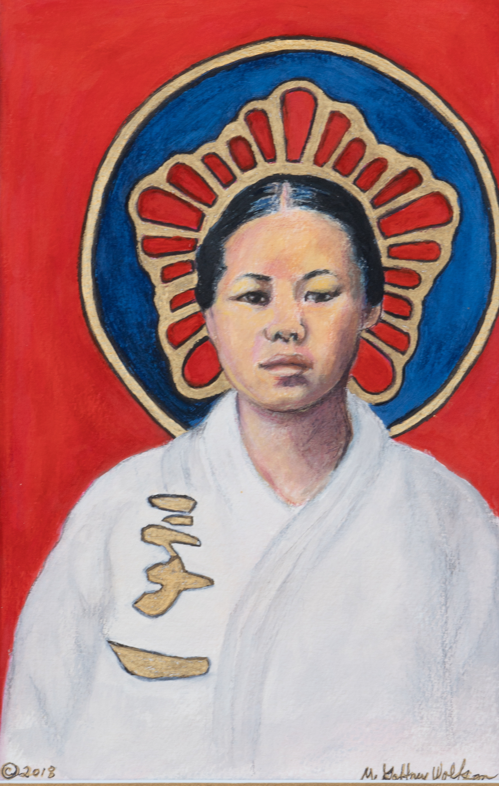 The eponymous Yu Gwan-Sun is one of a series of works honoring the 17-year-old voice for religious freedom that was requested for the 100th Anniversary of the invasion of Korea. Maureen Gaffney Wolfson’s giclee on metal work is a work of bold fearlessness, a tribute to the young martyr.